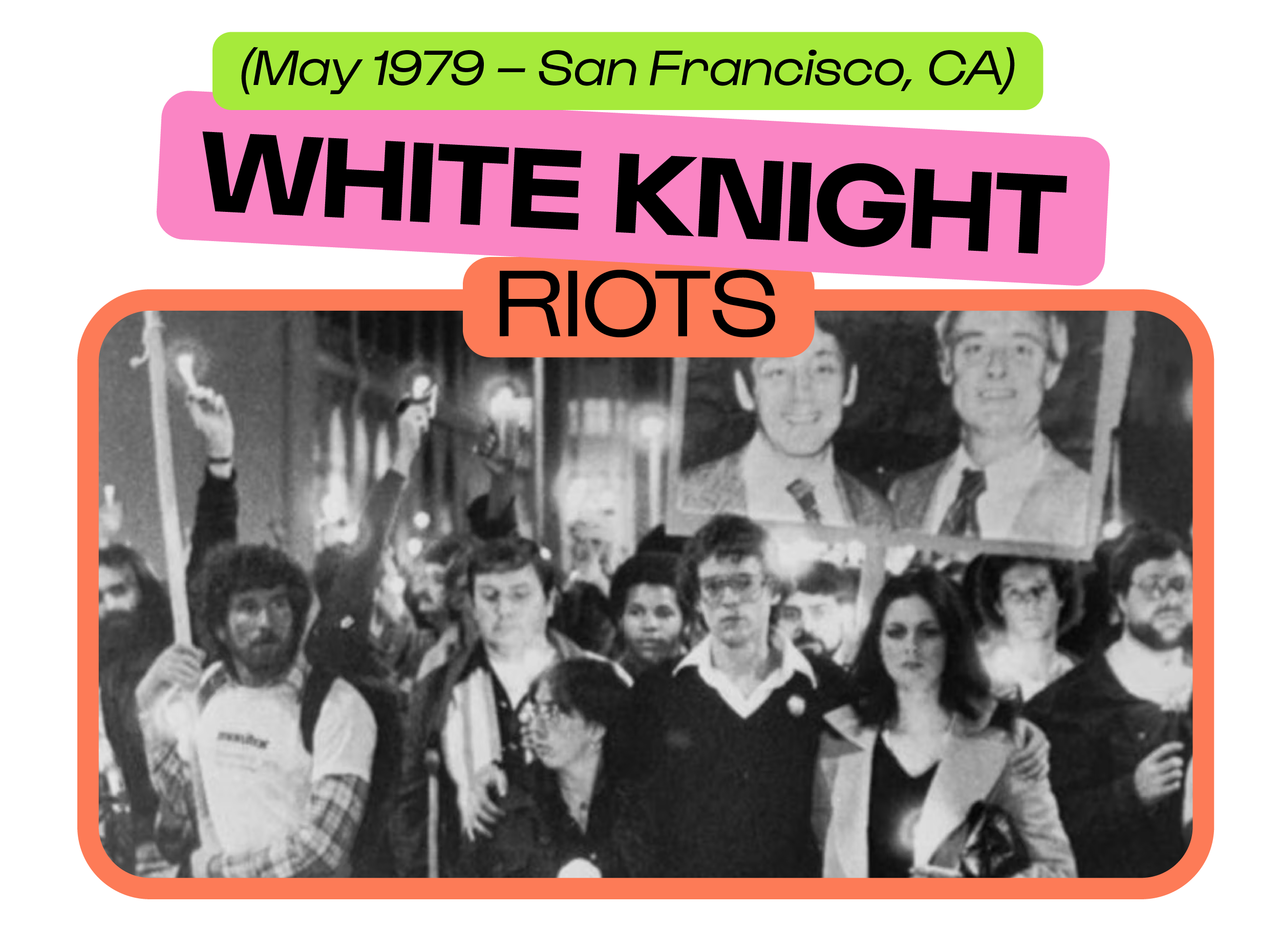 “On May 21, 1979, thousands of members of San Francisco’s predominantly gay Castro District community took to the streets to protest the lenient sentence received by Dan White for the murders of local politician and gay rights activist Harvey Milk and Mayor George Moscone. Harvey Milk became the first openly gay person elected to a public office in the state of California when he was elected to the San Francisco Board of Supervisors in 1977. His murder, as well as that of Mayor Moscone, devastated not just the gay community, but the city as a whole.”