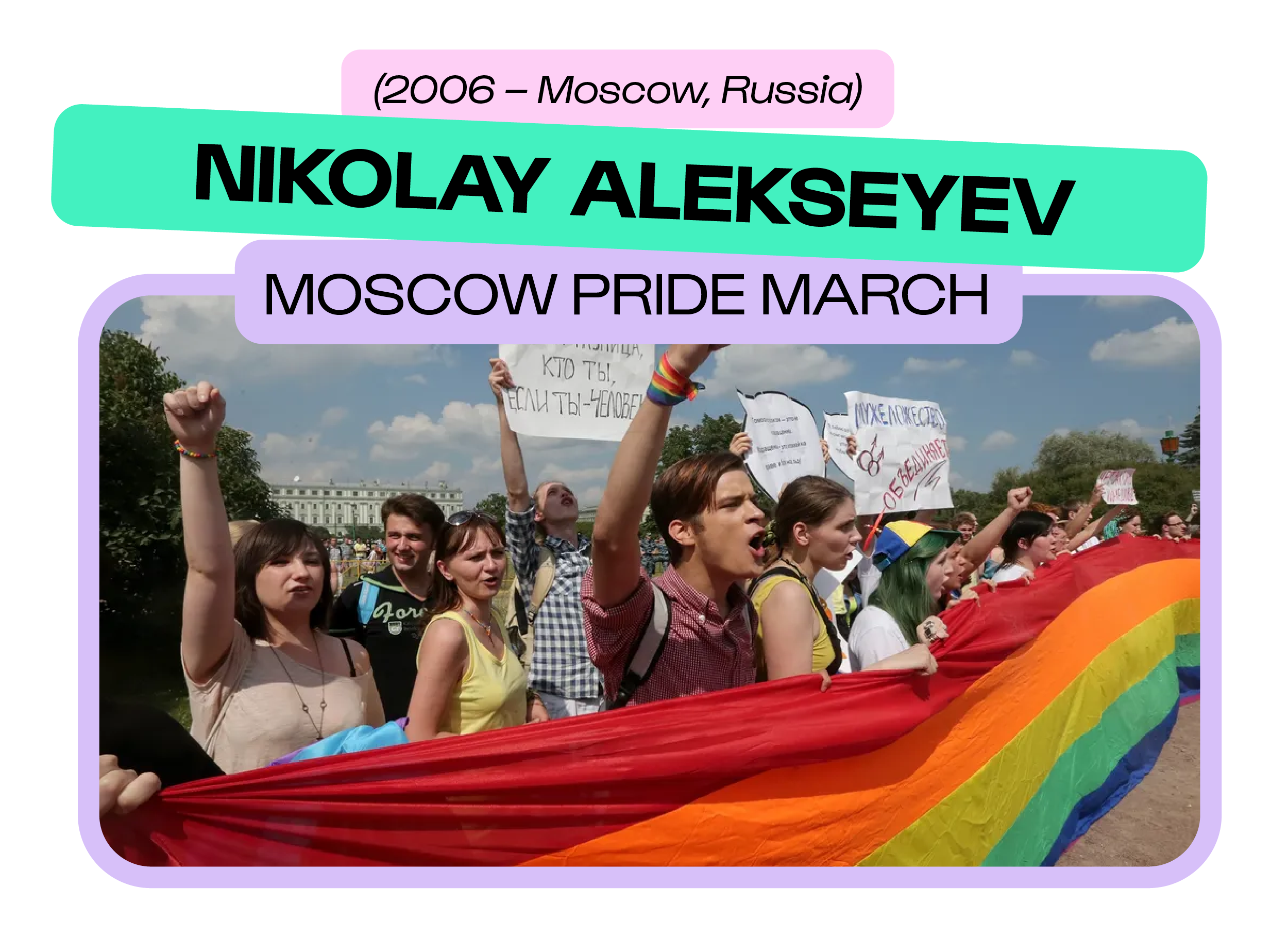 “During the first (unsanctioned) Pride march in Moscow, marchers were met with a heavy police presence, while various conservative and neo-Nazi groups looked on. When the marchers attempted to lay flowers at the Tomb of the Unknown Soldier, a mass brawl broke out and multiple arrests were made...Nikolay Alekseyev, a lawyer and the founder of GayRussia.Ru, an LGBT rights organisation based in Moscow, tried 164 times to obtain permission to hold a Pride event, never once receiving a positive response.”
