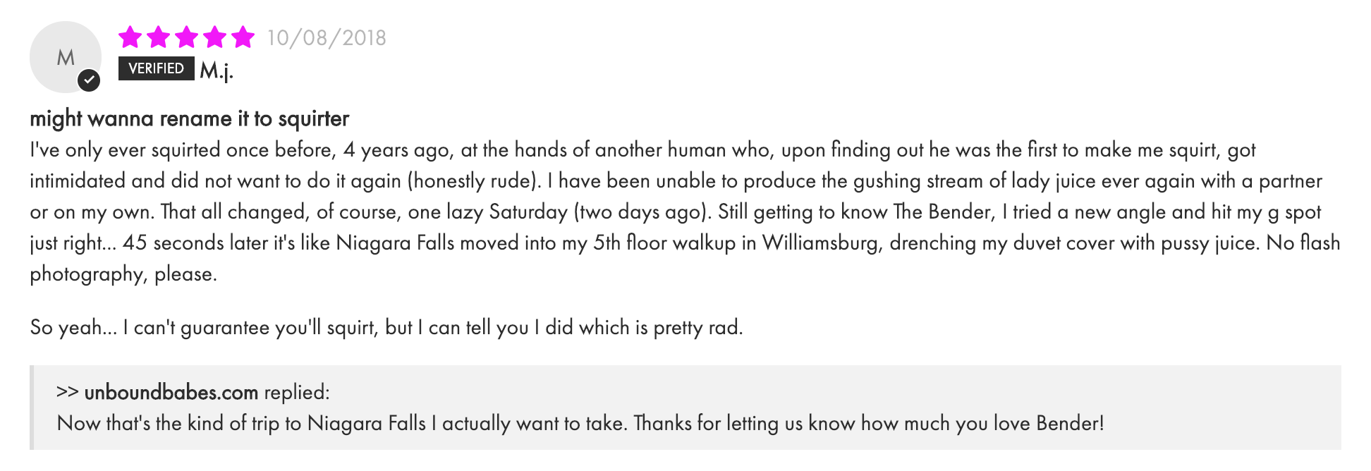 If you're interested in exploring your squirting potential, we recommend checking out Bender! If you're skeptical, the reviews speak for itself.