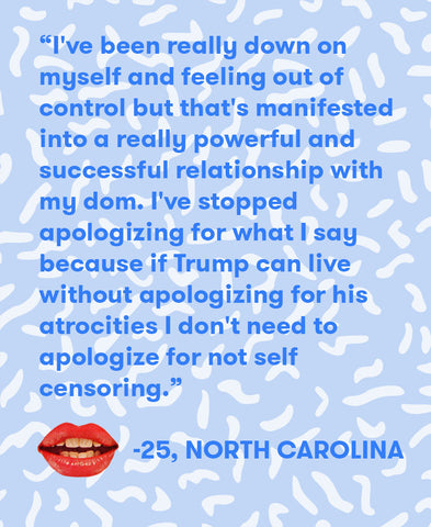 With all these changes to our routine, our political engagement and our society, we were curious: is everyone still getting laid? If you’re scrolling through your Twitter feed while laying in bed, are you making time for pleasure with your partner or yourself? If you’re unsure whether or not your Tinder date is one of the 63% of white men or 53% of white women who voted for Trump, are you still going to hook up afterwards without that confirmation? And who among us hasn’t felt that deep chilling feeling when someone we know or admire declares their support for the president. These experiences weigh on us and they can make us feel like we’re not up to our normal routines.