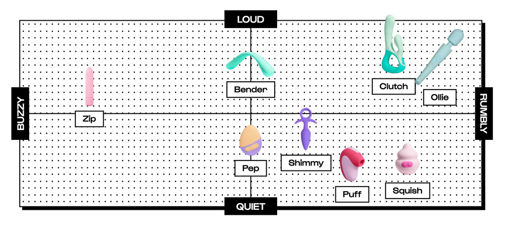 Choosing a toy that delivers both discretion and pleasure can be a difficult line to toe. Luckily, we've created a vibe matrix of all our vibes and where they stand. If you're looking for something that's rumbly and quiet, we recommend Pep, Shimmy, Puff or Squish.