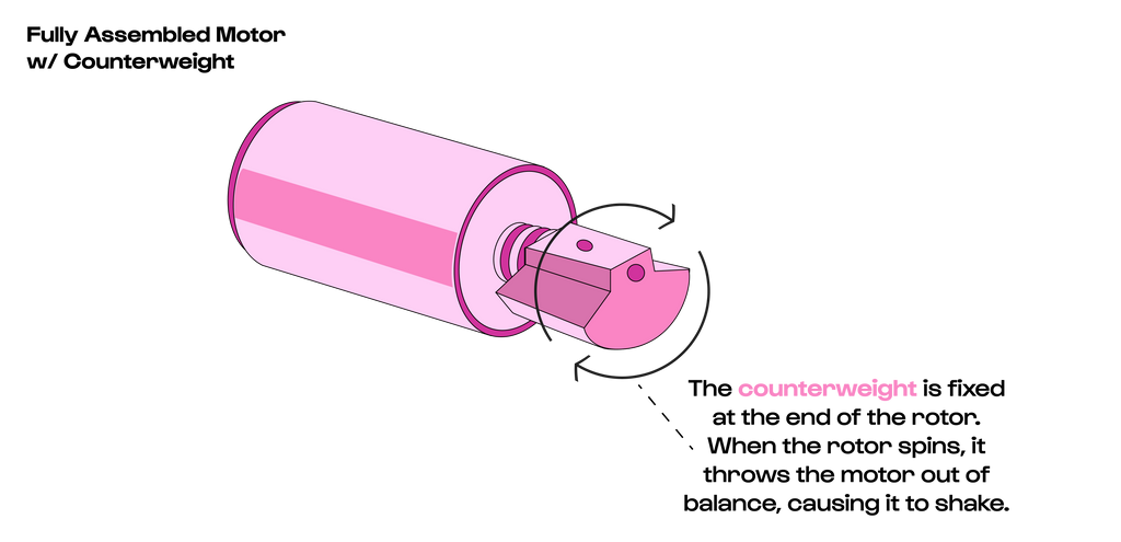 The weight, size, and shape of the counterweight can vary greatly and each variable influences the type of vibration produced. For example, more compact, lighter counterweights rotate more quickly on a smaller circumference, creating a buzzy vibration sensation. Conversely, larger and heavier counterweights will rotate a bit slower due to the greater mass and create a more rumbly vibration as a result. The type of metal the motor is made of can also influence the strength of the vibration, as some metals are heavier than others.