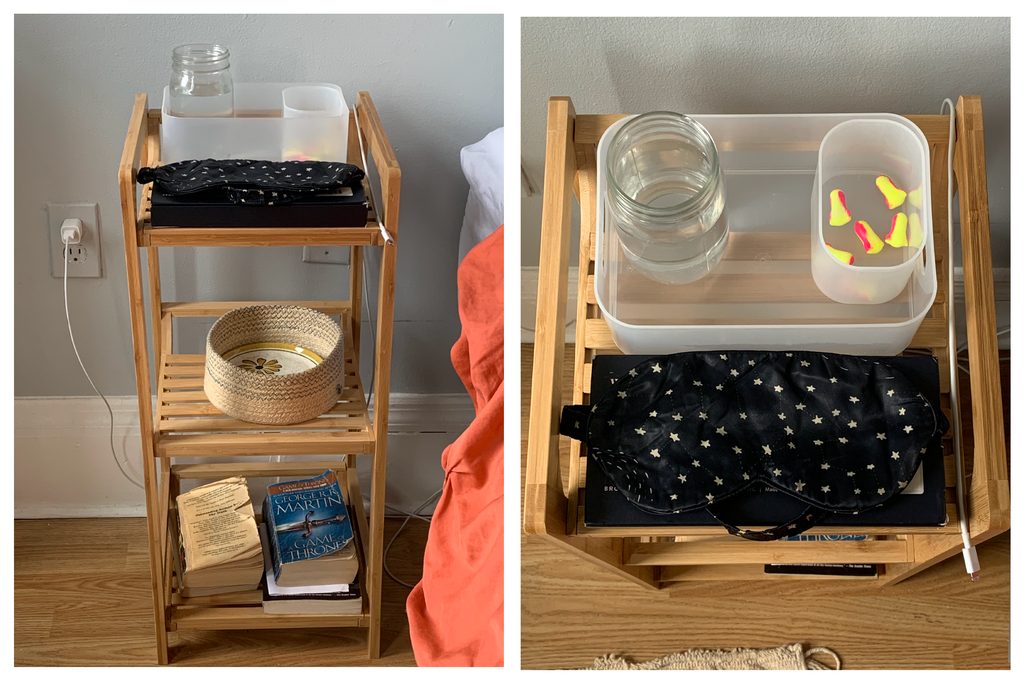 My nightstand is very functional-- the top level contains all the items I need for sleep, and organizes them to prevent them falling over or spilling.