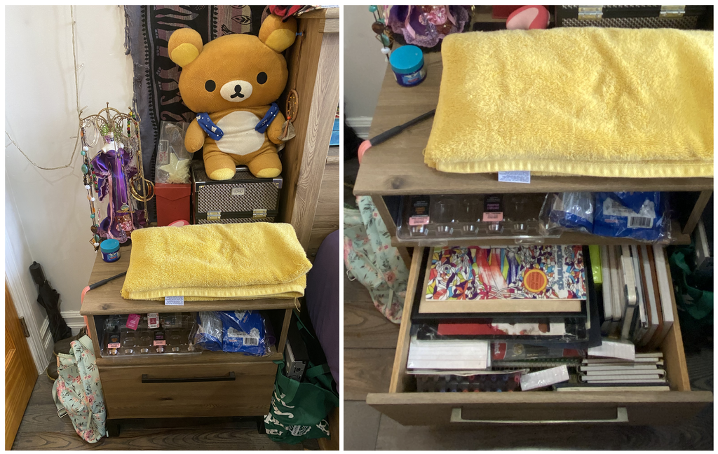 I love it, but my nightstand is nothing special, and is mostly used for storage! I have a bookcase bed frame, so most of the quick grab items are kept in those lil' cubbyholes, but there's a lot of miscellany going on over here too.