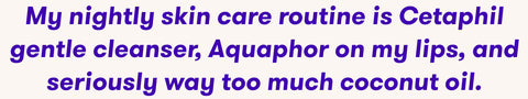 My nightly skin care routine is Cetaphil gentle cleanser, Aquaphor on my lips, and seriously way too much coconut oil. Before bed I lather my face and body with coconut oil. Sometimes I go a bit overboard…