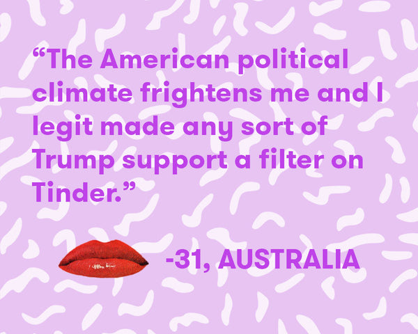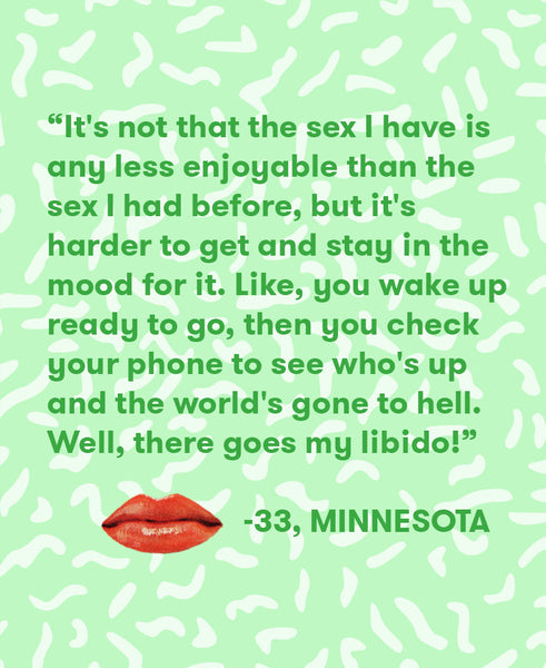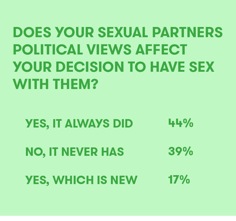 With all these changes to our routine, our political engagement and our society, we were curious: is everyone still getting laid? If you’re scrolling through your Twitter feed while laying in bed, are you making time for pleasure with your partner or yourself? If you’re unsure whether or not your Tinder date is one of the 63% of white men or 53% of white women who voted for Trump, are you still going to hook up afterwards without that confirmation? And who among us hasn’t felt that deep chilling feeling when someone we know or admire declares their support for the president. These experiences weigh on us and they can make us feel like we’re not up to our normal routines.